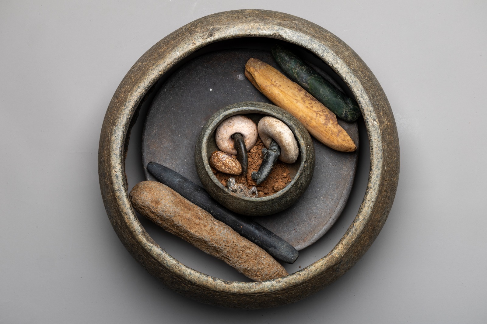 Qazıntılar zamanı daşdan hazırlanmış qablar və boşqabların xüsusi ardıcıllıqla, bir-birinin üzərinə yığılmış vəziyyətdə düzüldüyü məlum olub. Bu kompozisiyanın içində daşdan yonulmuş heyvan fiqurları, daş əsalar, muncuqlar və qırmızı steril torpaqla möhürlənmiş qablar aşkar edilib. Ətraf mühitdə isə canavar çənəsi, bəbir sümüyü, qartal və tülkü kimi heyvanların sümükləri simvolik şəkildə düzülüb.