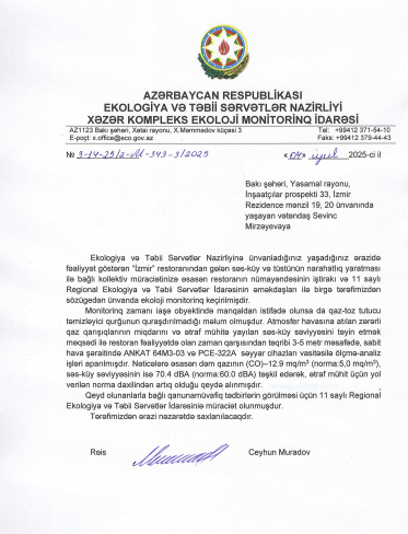 İddialarla bağlı Ekologiya və Təbii Sərvətlər Nazirliyinə də sorğu ünvanladıq. 11 saylı Regional Ekologiya və Təbii Sərvətlər İdarəsinin rəisi Qafar Ağayev bildirib ki, “İzmir” restoranından havaya tüstünün və ətrafa səs-küyün yayılması ilə bağlı daxil olan şikayət yerində araşdırılıb.